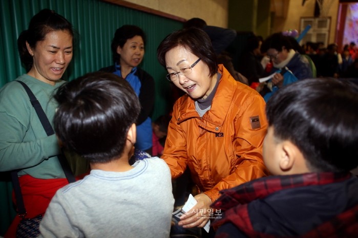 신연희 강남구청장(가운데)이 지난 7일 오전 10시 강남구 신구초등학교에서 열린 '주민과 함께하는 가을 한마당 축제'에 참석해 어린이들과 인사를 하고 있다.(사진제공=강남구청)