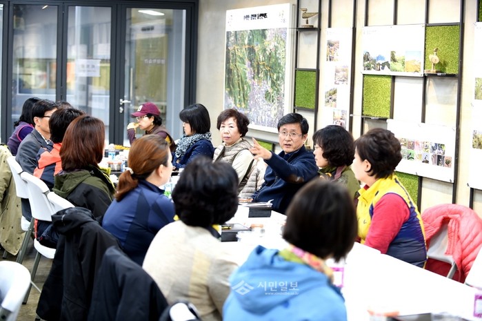 서울 노원구는 10일 중계동 산40-1 불암산 생태학습관에서 '숲·생태 프로그램 간담회'를 개최했다. 사진은 간담회에 참석한 김성환 구청장이 지역 주민들과 함께 불암산 숲 체험 프로그램 공유 및 활성화 방안에 대해 이야기를 나누는 모습.(사진제공=노원구청)