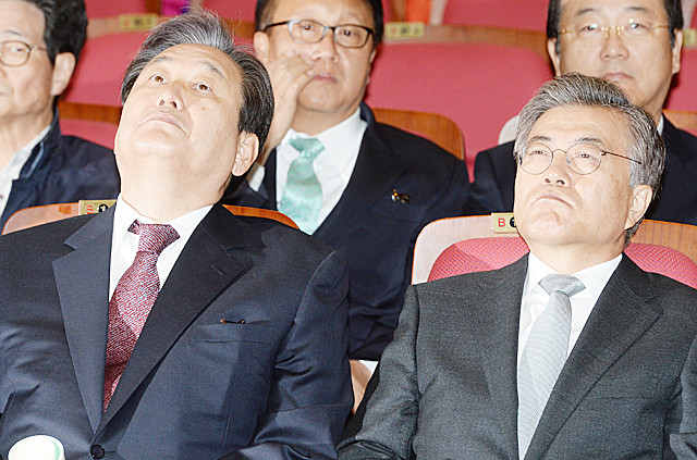 10일 오전 서울 여의도 국회 의원회관에서 열린 기부천사와 함께하는 나눔 토크콘서트에 참석한 새누리당 김무성 대표와 새정치민주연합 문재인 대표가 허공을 바라보고 있다.