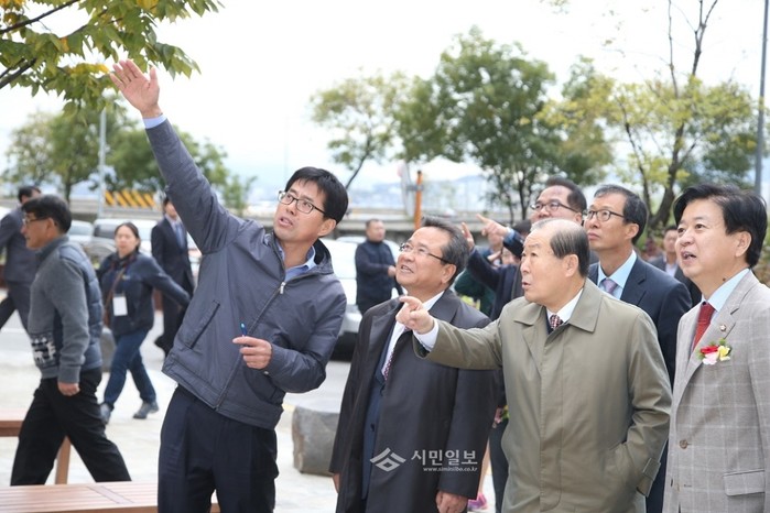 지난 9일 박홍섭 마포구청장(오른쪽에서 두 번째)이 밤섬문화공원에서 열린 '밤섬문화공원 재단장 축하 기념식 및 축하 행사'에 참석한 가운데 관계자에게 재정비를 마친 밤섬문화공원에 대한 설명을 듣고 있다. (사진제공=마포구청)
