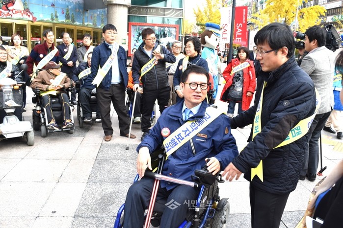 지난 11일 서울 노원구가 '지체장애인의 날, 보행인의 날'을 맞아 롯데백화점 사거리, 은행사거리 일대에서 '우측 보행질서 확립' 캠페인을 개최한 가운데 김성환 구청장이 휠체어를 탄 캠페인 참가자를 밀어주며 함께 홍보활동을 펼치고 있다. (사진제공=노원구청)