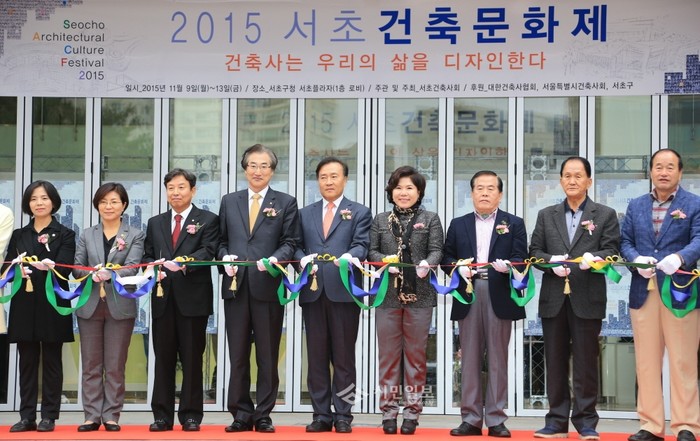 최근 서초구청사 앞에서 서초건축사회 주최·주관으로 개최된 '2015 서초문화제' 행사에서 조은희 구청장(오른쪽에서 네 번째)이 행사 관계자들과 테이프 커팅식을 앞두고 기념촬영을 하고 있다. (사진제공=서초구청)