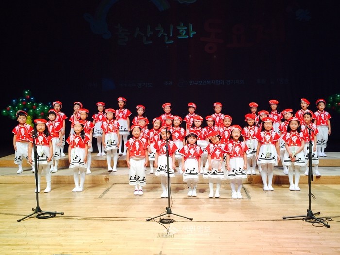 경기 과천 시립 갈현어린이집이 최근 경기도문화의전당 행복한대극장에서 열린 ‘제5회 경기도 출산친화 동요제’에서 최우수상을 차지했다. 사진은 갈현 어린이집 어린이들이 동요제 무대에 오른 모습.(사진제공=과천시청)