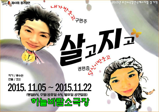 극단 아센의 43회 정기공연작인 '살고지고'는 부산 남구 하늘바람소극장에서 오는 22일까지 평일 저녁 8시, 주말 오후 4시 공연이다. 단, 월요일은 휴관이다.