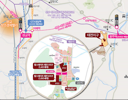 '태전 힐스테이트' 들어서는 광주시 최초의 신도시인 태전지구는 고산지구와 함께 경기 광주시 태전동과 오포읍 고산리 일대 약 120만㎡ 규모로 조성되는 민간도시개발사업구역이다. 광주시 최대 규모인 태전지구는 고산지구와 함께 개발되는 신흥 주거단지로 향후 총 1만 8000여 가구가 들어서게 된다.