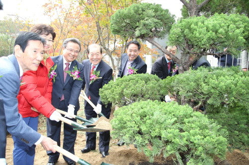마포구는 최근 망원유수지에 건립된 '마포구민체육센터' 개관식을 진행했다. 사진은 행사에 참석한 박홍섭 구청장(왼쪽 네 번째), 차재홍 마포구의회의장(왼쪽 세 번째) 등이 기념식수를 하고 있는 모습.(사진제공=마포구청)
