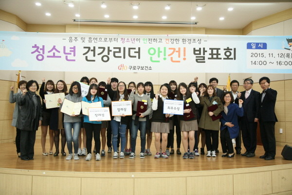 최근 서울 구로구청 강당에서 진행된 '청소년 건강리더 안건 발표회'에 참가한 건강리더들이 안건 발표 후 시상식을 마치고 함께 기념촬영을 하고 있다.(사진제공=구로구청)