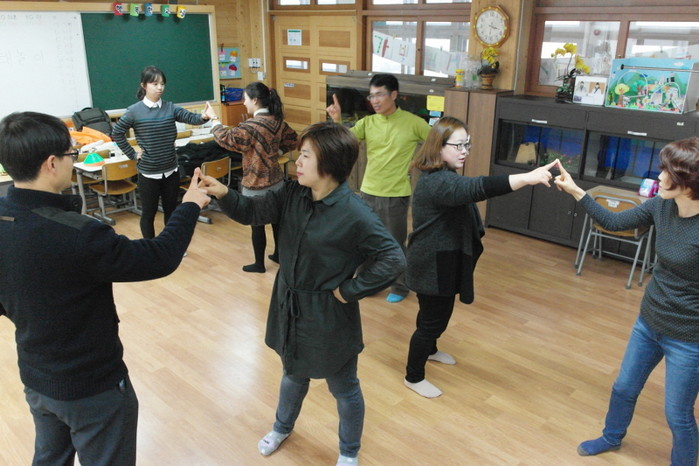경기 가평 상면초등학교는 최근 상면초 소속 교원을 대상으로 ‘교육과정 재구성 연수’를 실시하였다. 사진은 교육에 참석한 관계자들이 '생태놀이를 적용한 교육과정 재구성'이라는 주제로 생태놀이 실습을 하는 모습.(사진제공=가평 상면초등학교)