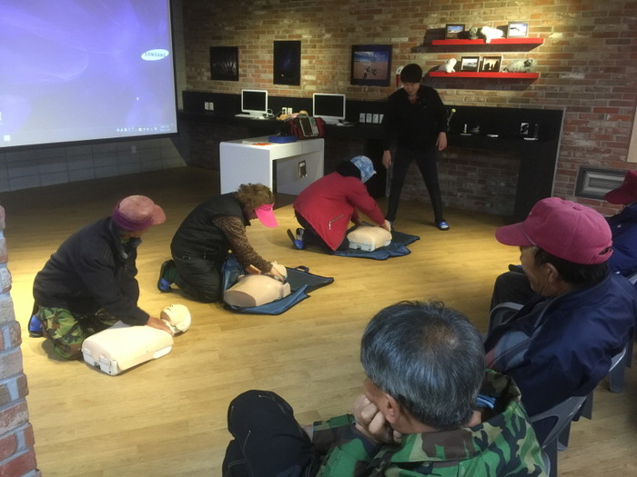 인천중부소방서 백령119안전센터는 최근 옹진군 백령면 공공근로자 60여명을 대상으로 심폐소생술 교육을 실시했다. 사진은 교육에 참석한 근로자들이 심폐소생술 실습을 하는 모습.(사진제공=인천중부소방서)