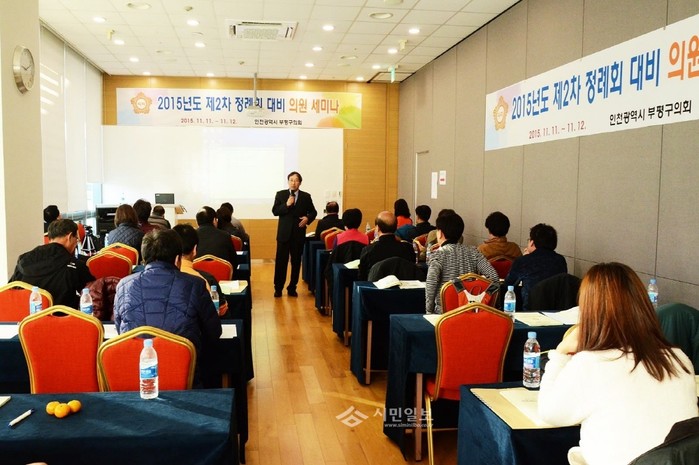 | ▲ 인천 부평구의회가 2015년 제2차 정례회를 대비해 최근 의원 세미나를 개최한 가운데 참석 의원들이 강의를 듣고 있다.(사진제공=부평구의회) | ||