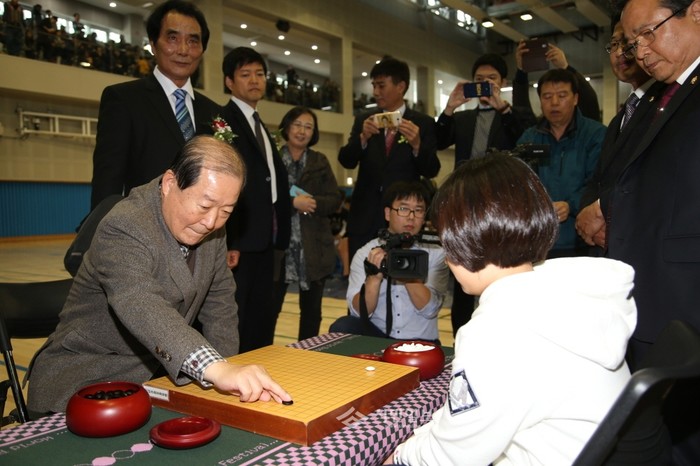 지난 15일 마포구와 마포구생활체육회가 주최하고 마포구 바둑연합회가 주최한 '제1회 마포구청장배 꿈나무 바둑대회'가 마포구민체육센터 체육관에서 개최된 가운데 박홍섭 구청장(왼쪽)이 한 어린이와 바둑을 두고 있다. (사진제공=마포구청)