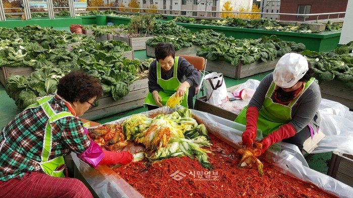 도봉구 도봉1동 주민센터가 최근 동주민센터 옥상에 조성된 텃밭에서 직접 재배한 배추로 '김장김치 담그기 행사'를 연 가운데 행사에 참여한 자원봉사자와 직원들이 김치를 담그고 있다. (사진제공=도봉구청)