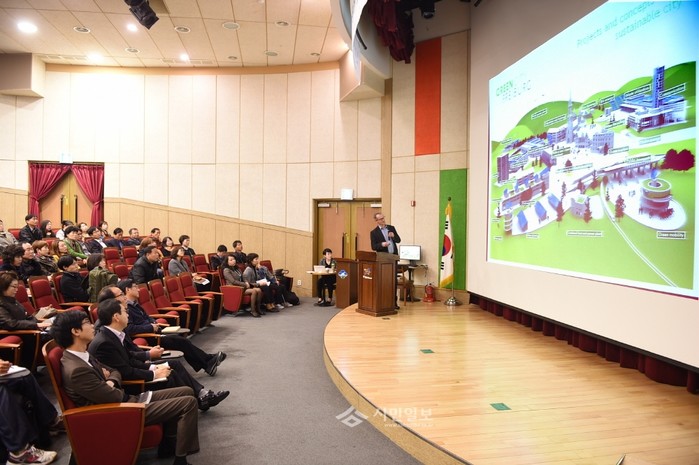노원구가 최근 구청 6층 소강당에서 ‘신재생에너지 전문가 초청 강연회’를 개최해 독일 프라이부르크 대학 제라드 스트리힙 물리학 박사가 ‘지속가능한 도시 에너지 시스템의 설계’라는 주제로 강연을 하고 있다.(사진제공=노원구청)