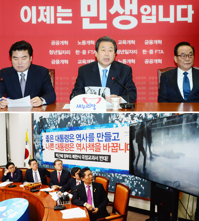 16일 오전 서울 여의도 국회에서 열린 새누리당 최고위원회의에서 김무성 대표가 모두발언을 하고 있다. 김 대표는 광화문 집회에 관련 “관계 당국은 엄격한 법 집행을 하는데 자신의 직을 걸어야 할 것”이라고 강조했다(위). 새정치민주연합 정청래 최고위원이 16일 오전 서울 여의도 국회에서 열린 최고위원회의에서 민중총궐기 투쟁대회에서 경찰의 고압 물대포를 맞으며 쓰러져 중태에 빠진 한 농민의 당시 상황과 관련된 미공개 영상을 보여주고 있다.