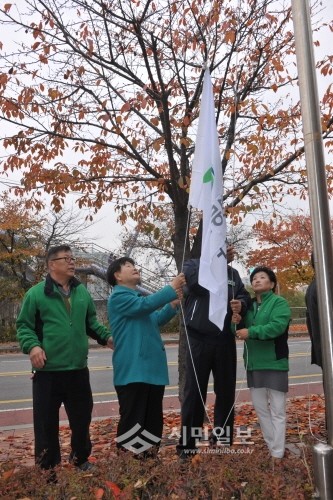 박정자 서울 영등포구의회 의장(왼쪽에서 두 번째)은 지난 16일 여의도새마을공원에서 열린 '주민 쉼터 문화공원 가꾸기' 행사에 참석해 참여자들과 함께 구의 휘장이 새겨진 깃발을 게양하고 있다.(사진제공=영등포구의회)