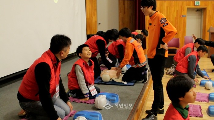 서대문소방서에서는 지난 14일 오전 9시 기아자동차 임직원 가족봉사단 60명을 대상으로 '생명·안전지킴이 서대문소방관과 함께하는 소방안전교육'을 실시했다. 사진은 심폐소생술 교육이 진행 중인 모습.(사진제공=서대문소방서)