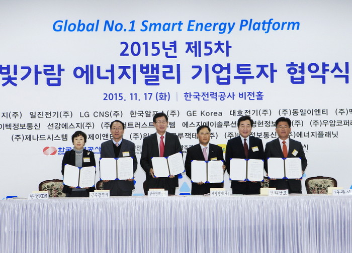 [시민일보=여영준 기자]한국전력(사장 조환익)은 17일 오전 11시 본사 비전홀에서 한전KDN, 지자체(광주광역시, 전라남도)와 함께 세방전지(주) 등 3개 대기업, 외국기업인 GE코리아와 한국알프스(주)를 비롯해 대호전기(주) 등 중소기업 12개, Start-up 및 연구소기업 등 총 20개사와 에너지밸리 투자 협약식을 체결했다.