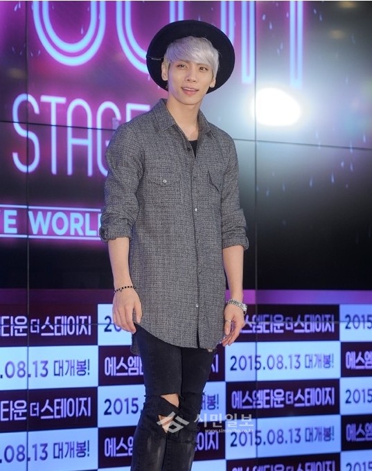 이 날 샤이니 종현은 그레이 컬러톤의 셔츠를 걸치고 블랙컬러의 디트로이트진을 입고 카메라를 향해 웃음짓고 있다.