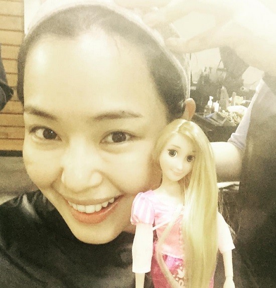 게재된 사진 속 이하늬는 머리카락을 관리 받는 가운데 라푼젤 인형을 들고 환한 미소를 짓고 포즈를 취하고 있다.