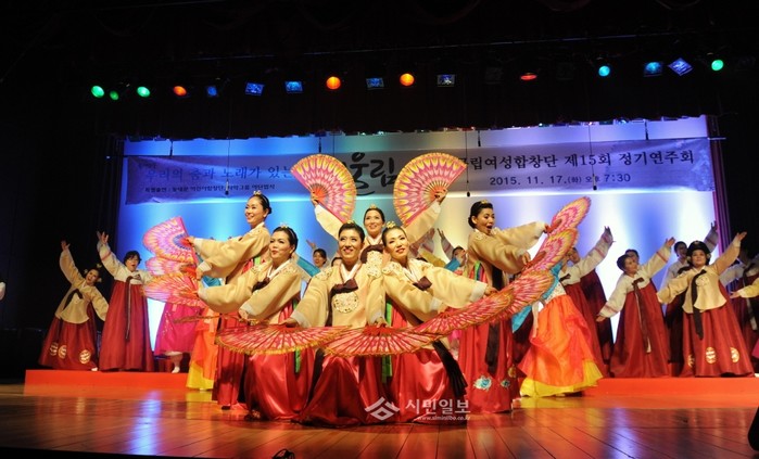서울 동대문구가 지난 17일 오후 7시30분 구청 2층 대강당에서 동대문구립여성합창단의 제15회 정기연주회를 개최한 가운데 합창단의 노래에 맞춰 무용단이 무대에 올라 부채춤 공연을 펼치고 있다.(사진제공=동대문구청)