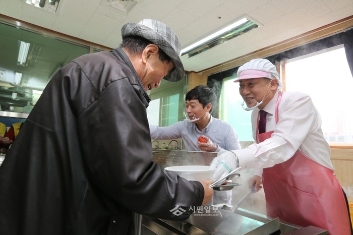서울 금천구는 지난 17일 오전 11시 금천한내복지관에서 강당 증축 개관식을 개최했다. 사진은 행사에 참석한 노인들을 위한 점심 배식을 하고 있는 차성수 구청장(오른쪽)의 모습.(사진제공=금천구청)