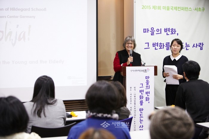서울 서초구는 지난 16·17일 일본과 독일에서 방문한 마을활동가들과 함께하는 '제1회 마을국제컨퍼런스'를 개최했다. 사진은 16일 독일 마을활동가 힐데가르드 쇼스의 강연이 진행 중인 모습.(사진제공=서초구청)