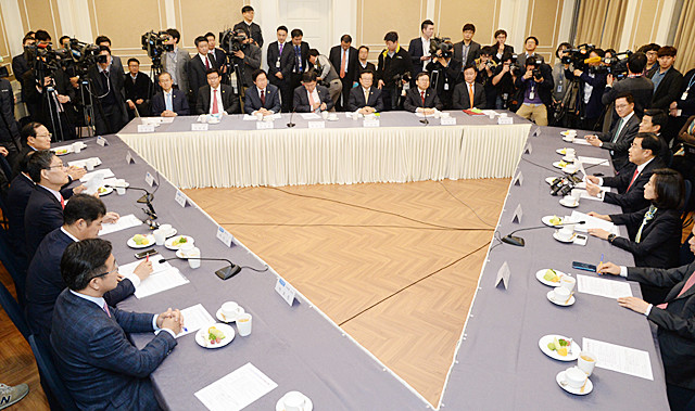 18일 오전 서울 여의도 국회 귀빈식당에서 열린 여야정협의체 1차회의에서 새누리당 김정훈 정책위의장이 인사말을 하고 있다.