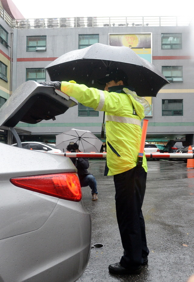 18일 오후 민주노총 한상균 위원장이 피신한 곳으로 알려진 서울 종로구 조계사 관음전 앞에서 경찰들이 검문을 하고 있다.