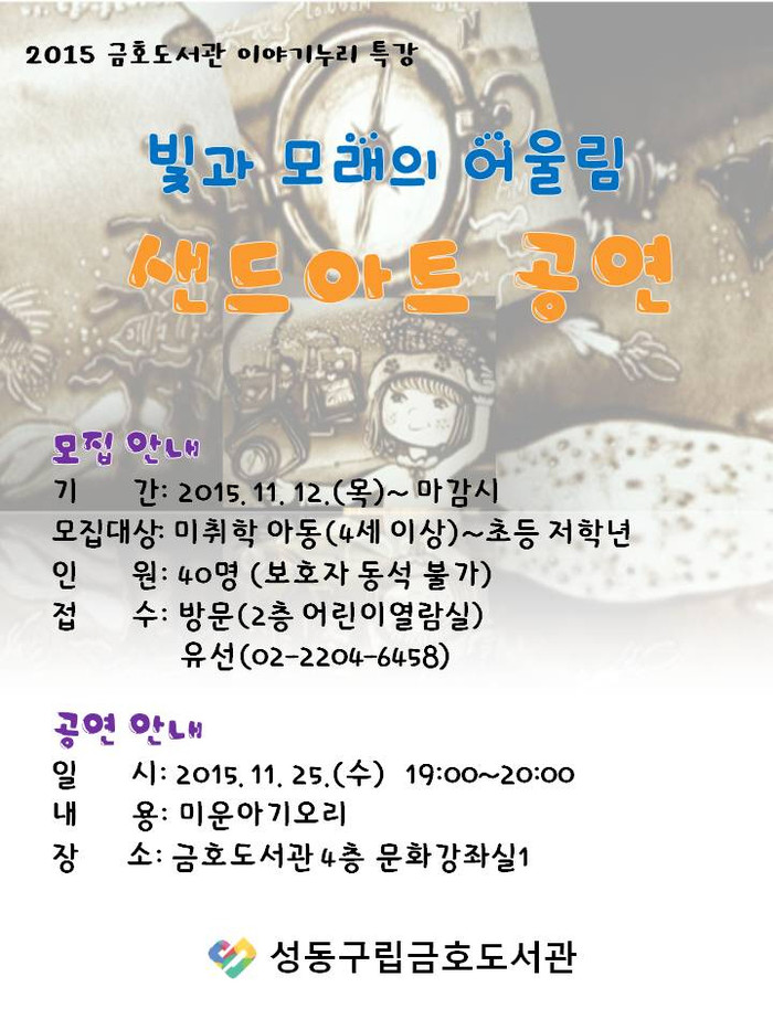 [시민일보=이대우 기자] 서울 성동구(구청장 정원오) 금호도서관에서 25일 오후 7시부터 어린이들을 대상으로 빛과 모래가 어울려지는 라이브 샌드아트 공연을 개최한다.