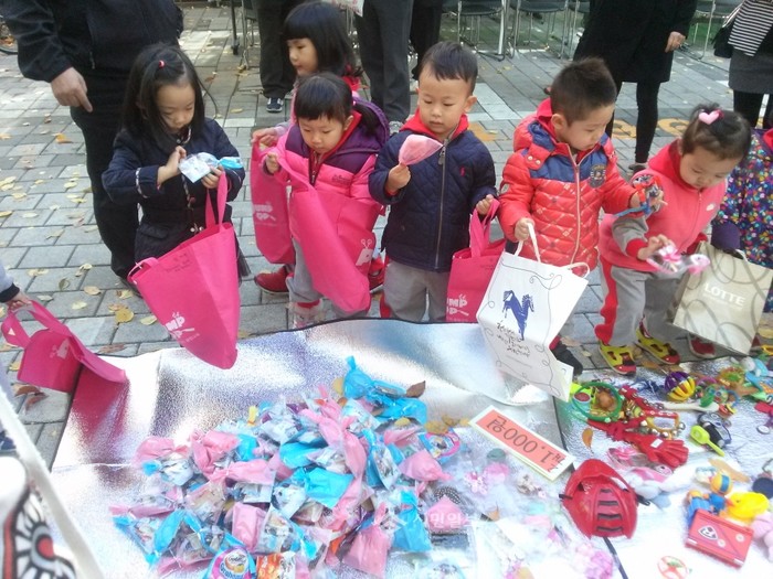 최근 은평구 미성어린이집 주관으로 응암제1동에서 열린 ‘따뜻한 겨울나기 사랑의 바자회’를 방문한 아이들이 물건을 살펴보며 고르고 있다.(사진제공=은평구청)