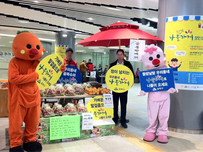 지난 18일 서울 송파구 잠실 롯데월드몰 지하광장에서 골목상권의 침체로 고사위기에 처해 있는 골목슈퍼 ‘나들가게’의 홍보를 관계자들이 하고 있다.(사진제공=송파구청)