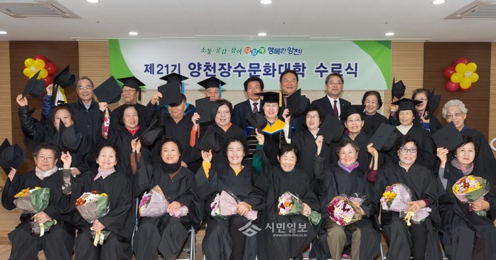 지난 18일 오전 서울 양천구 목5동 주민센터에서 열린 '제21기 양천장수문화대학 수료식'에 참석한 김수영 양천구청장(가운데)이 노인들과 함께 기념촬영을 하고 있다.(사진제공=양천구청)