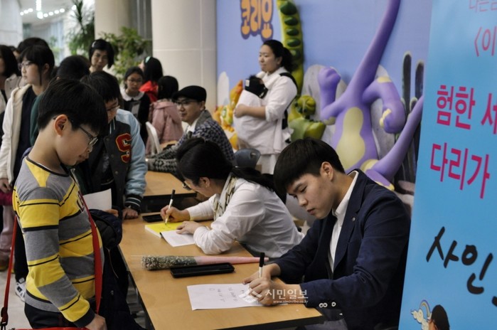 지난 21일 오후 4시 경기 화성시 동탄문화복합센터 반석아트홀에서 장애인 국가대표 수영선수 김세진씨와 어머니 양정숙씨의 '험한 세상에 다리가 되어' 강연이 진행됐다. 사진은 강연 후에 김 선수가 사인회를 진행하는 모습.(사진제공=화성시문화재단)