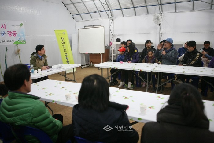 이해식 강동구청장은 지난 21일 오전 9시30분부터 강일동 도시텃밭(강일동 33-3)에서 한 시간 동안 '제137차 찾아가는 구청장실'을 진행했다. 사진은 이 구청장이 행사에 참석한 관계자들과 대화를 나누는 모습.(사진제공=강동구청)