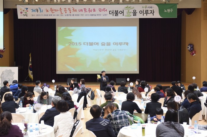 노원구가 최근 구청 2층 대강당에서 개최한 ‘노원마을공동체 워크숍’에 김성환 구청장(중앙)이 참석해 인사말을 하고 있다.(사진제공=노원구청)