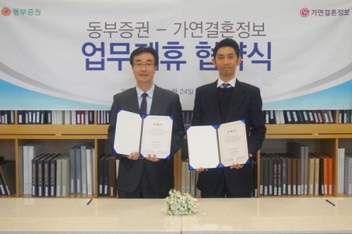 결혼정보회사 가연(대표이사 김영주)은 동부증권(대표이사 사장 고원종)과 지난 24일 업무 협약식을 갖고, 동부증권 고객을 대상으로 결혼정보서비스를 제공한다고 25일 밝혔다.