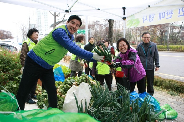 이해식 서울 강동구청장(왼쪽)은 25일 오전 10시20분 지역내 친환경 농산물 직매장 '싱싱드림'에서 강동노인종합복지관의 '도시텃밭사업단'과 함께 도시텃밭사업단이 직접 키운 배추와 무를 판매했다.(사진제공=강동구청)
