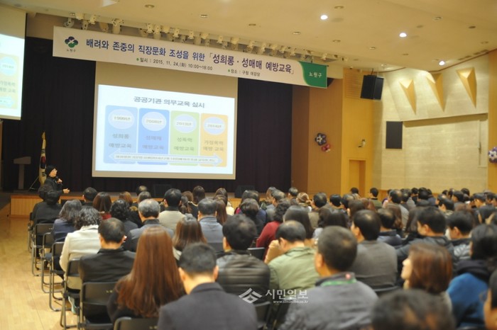 서울 노원구가 지난 24일 오전 10시 구청 2층 대강당에서 배려와 존중의 직장문화 조성을 위한 ‘2015 성희롱·성매매 예방교육’을 실시해 구청 직원들이 강사로부터 교육을 받고 있다.(사진제공=노원구청)