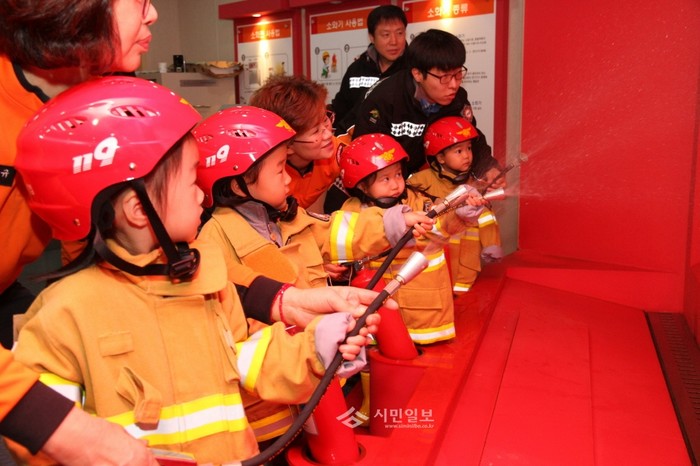 서울 동작소방서는 25일 오전 10시 소방서 3층 소방안전체험교실에서 사랑유치원 원아 10여명에게 소방안전교육을 실시했다. 사진은 어린이들이 소화기 사용 실습을 하는 모습.(사진제공=동작소방서)