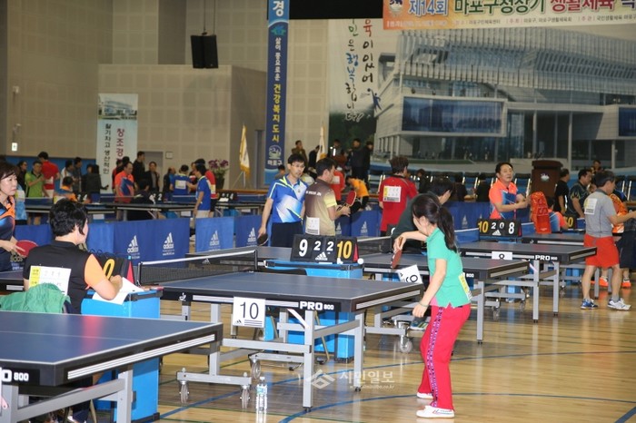 마포구는 최근 마포구민체육센터 체육관에서 '제26회 마포구청장기 생활체육 탁구대회'를 개최했다. 사진은 탁구대회에 참석한 관계자들이 경기 중인 모습.(사진제공=마포구청장)