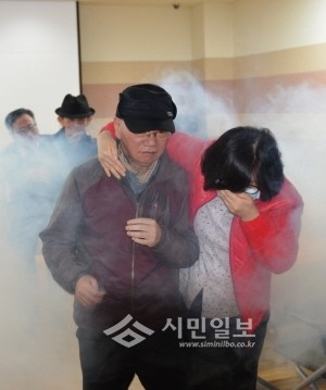 영등포소방서는 지난 24일 오전 구립 영등포노인케어센터에서 관계자와 노인 30여명을 대상으로 '소방안전교육'을 실시해 참여자들이 연기 속에서 화재대피 체험을 하고 있다.(사진제공=영등포소방서)