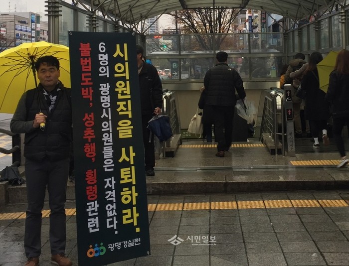 [광명=류만옥 기자]경기 광명경실련은 광명시의회 정례회 기간인 오는 12월16일까지 철산역 2번 출구에서 성추행·도박·횡령 등으로 검찰에 송치된 광명시의원에 대해 자진사퇴를 촉구하는 1인 시위를 진행한다. 사진은 25일 광명경실련 관계자가 1인 시위를 하는 모습.