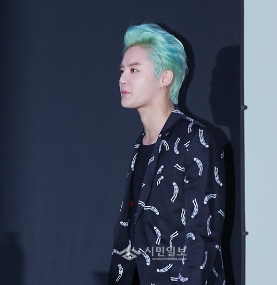 이 날 김준수는 멀리서 봐도 눈에 확 띄는 초록색 헤어스타일로 입장하고 있다.