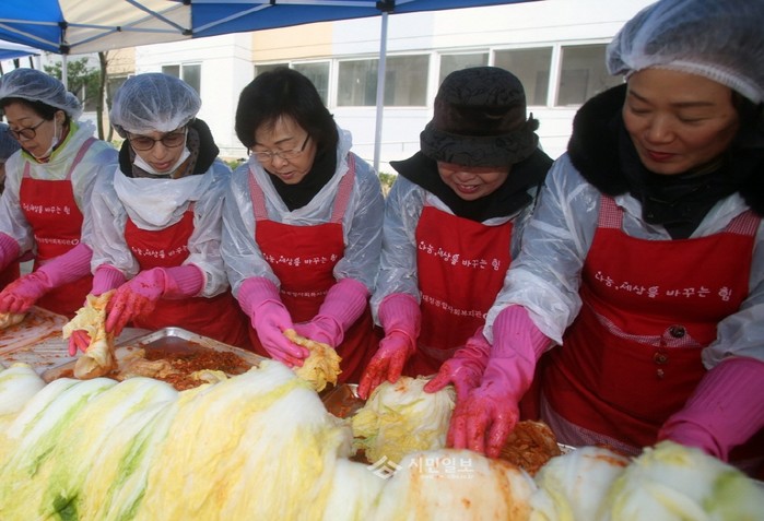 강남구는 지난 24일 오전 11시 대청종합사회복지관에서 '김치 담그기 행사'를 진행했다. 사진은 행사에 참석한 신연희 강남구청장(가운데)이 일원1동 부녀회원들과 함께 김치를 담그고 있는 모습.(사진제공=강남구청)