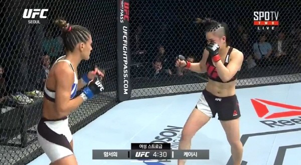 28일 서울특별시 송파구 올림픽공원 내 올림픽체조경기장에서 열린 'UFC 파이트나이트 서울' 경기에서 함서희는 코트니 케이시와 여성스트로급 경기를 펼쳤다.