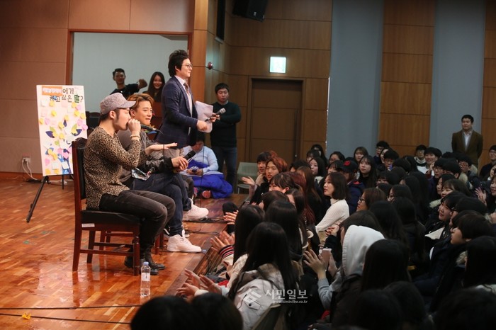| ▲ 구청 대강당에서 토크콘서트 형식으로 열린 가수 아웃사이더의 '아파쇼'에서 무대에 오른 아웃사이더와 참여 학생들의 모습. | ||