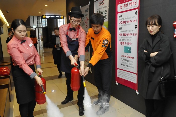 구로소방서는 지난 26일 오후 2시 구로구 경인로 662에 위치한 롯데시네마 신도림점에서 롯데시네마 관계자 및 영화관을 오가는 관람객들을 대상으로 '생활안전 이동홍보단'을 운영했다. 사진은 소화기 실습이 진행 중인 모습.(사진제공=구로소방서)