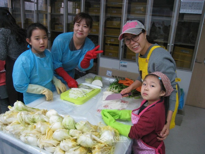경기 부천시 상동초등학교는 지난 27일 어머니와 어린이의 손으로 직접 만들어보는 '아삭아삭 사랑의 김장하기' 행사를 했다. 사진은 행사에 참석한 어머니와 어린이가 김장을 준비하며 기념촬영을 한 모습.(사진제공=부천교육지원청)
