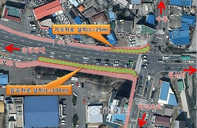 이번에 확보된 3억원의 특별교부금으로 마석사거리 일대 화도교회 방면 우회전 차량의 감속차로 100m, 반대방향 생명수교회 앞 우회전 차로의 가속차로를 25m 각각 설치하고 인도를 정비하게 된다.