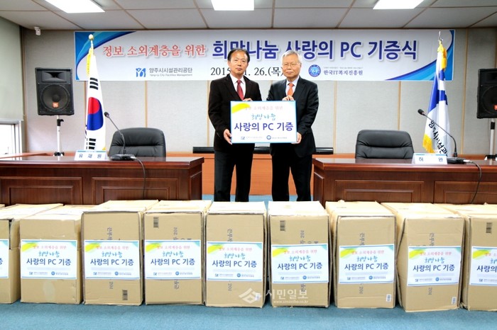 경기 양주시시설관리공단은 최근 (사)한국IT복지진흥원에 전산기기를 무상으로 전달하는 '희망나눔 사랑의 PC 기증식'을 진행했다. 사진은 기증식에 참석한 유재원 시설관리공단 이사장(왼쪽)의 모습.(사진제공=양주시청)